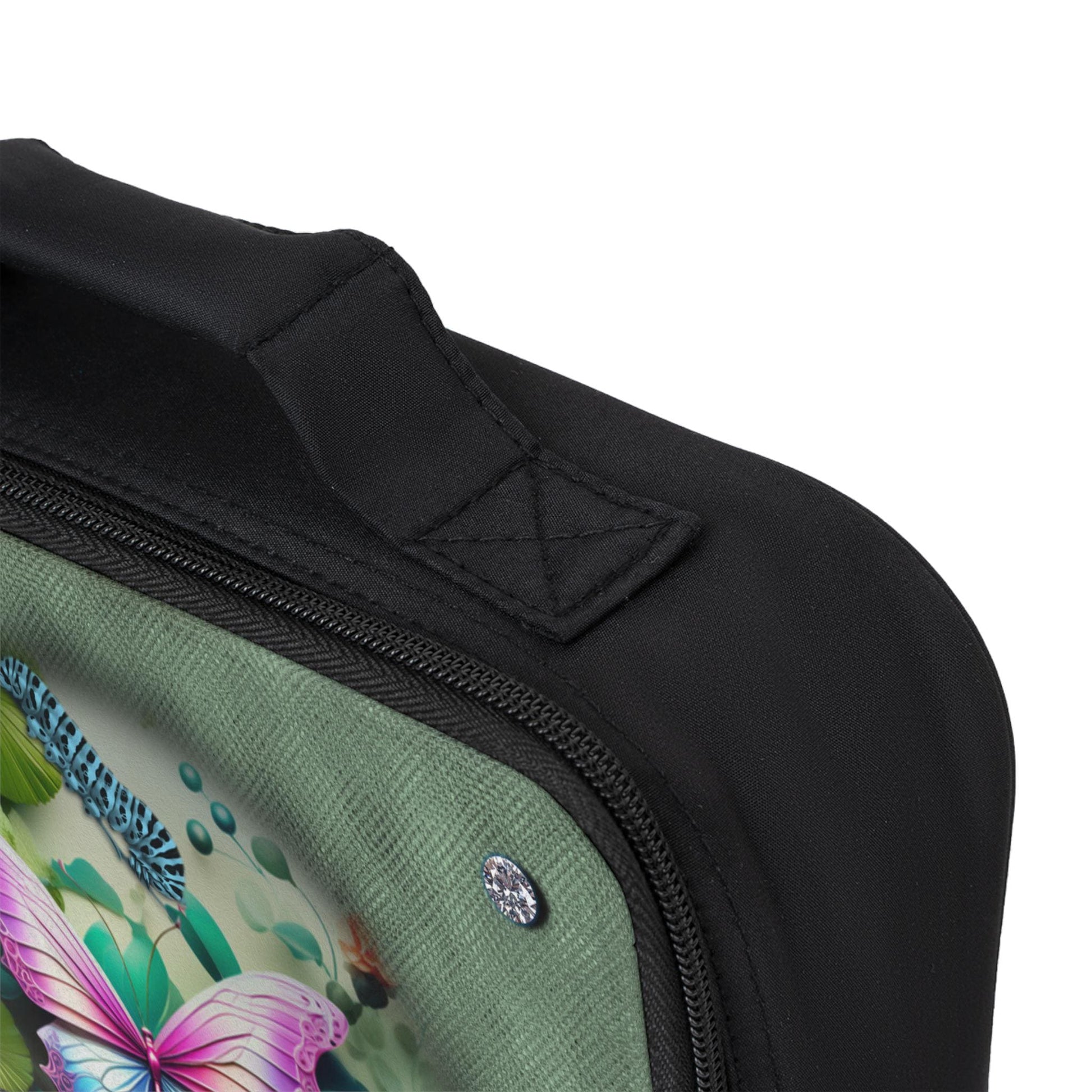 This vibrant lunch bag features large pink roses, a beautiful blue caterpillar, a colorful tree frog, and a yellow Monarch butterfly all set upon a textured red and green background. Perfect for nature lovers and those who enjoy colorful designs, this insulated lunch bag is ideal for carrying your meals in style. Great for picnics, outdoor events, school, or work.